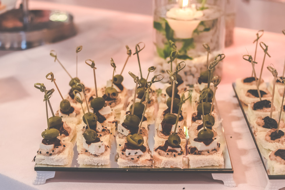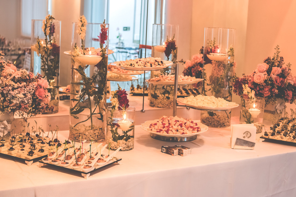 Também optamos por fazer uma mesa de antepastos, pra que além dos salgados finos e do jantar, nossos convidados pudessem estar sempre bem servidos. Para a mesa de antepastos escolhi canapés frios, alguns tipos de finguer foods, como ovo de codorna empanado no presunto de parma e redução de maracujá, super recomendo é delicioso. Também colocamos 8 variedades de queijos entre nacionais e importados.